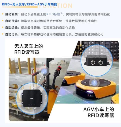 無人叉車與AGV小車在倉儲中越來越常見,而RFID技術的賦能,為這一領域注入更多可能。基于“RFID+無人叉車”和“RFID+AGV”解決方案,企業實現了貨物流轉的快速化、精準化,全面提升倉儲效率與信息流準確性。